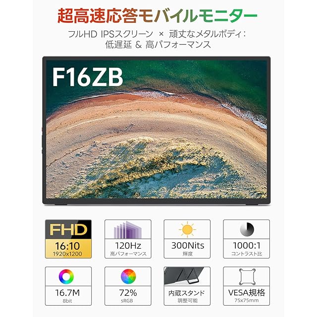 商品名:Intehill モバイルモニター 16インチ 120Hz 自立型スタンド 1920x1200 モバイルディスプレイ 16:10 非光沢IPS液晶パネル スイッチ用ゲーミングモニター USB Type-C/HDMI搭載/金属製 VESA対応 ポータブルモニター F16ZB