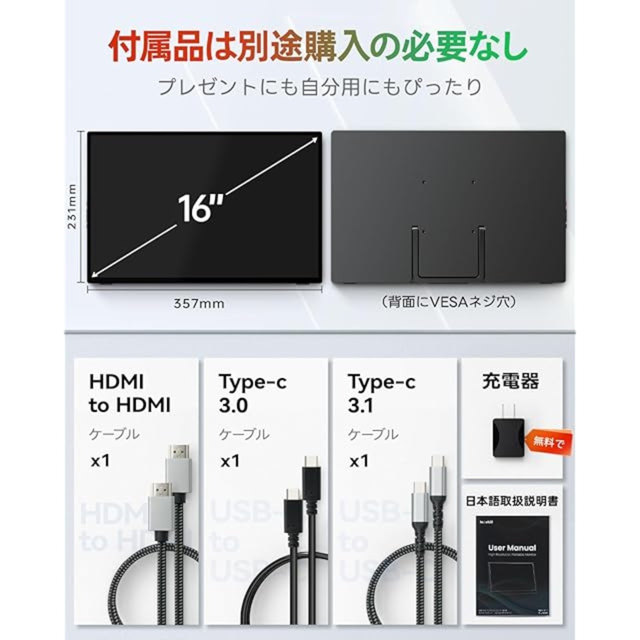 Intehill モバイルモニター 16インチ は、クリエイティブな仕事からエンターテインメントまで、あらゆるシーンで活躍する高品質ポータブルディスプレイです。 主な特長 ✔ プロ級視認性 AG(アンチグレア)非光沢IPSパネル採用で、屋外や明るい環境下でも眩光・反射を大幅低減。長時間作業でも目の疲れを軽減します。繊細な色再現性と広視野角を実現。 ✔ 黄金比16:10アスペクト比 従来の16:9より縦方向の表示領域が広く、文書編集・プログラミング・写真編集に最適。効率的なマルチタスクをサポート。 ✔ マルチデバイス対応 USB-C/HDMI端子を装備し、ミニPC/MacBook/ノートPC/Switchとシームレス接続。1本ケーブルで給電+映像伝送可能(DisplayPort Alt Mode対応)。