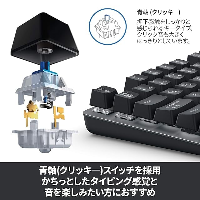 青軸(クリッキ―)/キーの押下感触をしっかりと感じられるキータイプ/かちっとしたタイピング感覚と音を楽しみたい方におすすめ