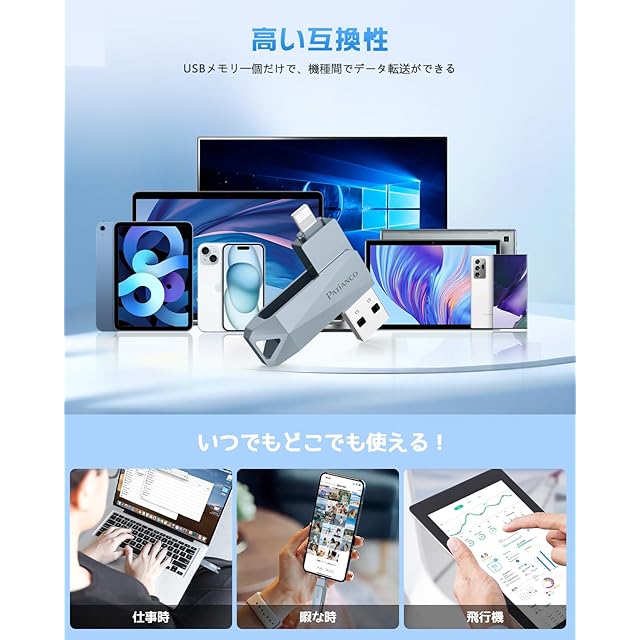 【高い互換性】弊社のUSBメモリはすべてのiOS機種に対応し、タイプCアダプターも付属しておるので、Type-CコネクタのiPhone、iPad、Type-C機種とも互換性があります。対応機種:iPhone 15 Pro Max/15 Pro/15 Plus/15/iPhone 14 Pro Max/14 Pro/14 Plus/14/SE 3/13 Pro Max/13 Pro /13/13 mini /12 Pro Max/12 Pro/12 /SE 2 /11 Pro Max/11 Pro/11 /XR/XS Max/XS /X /8 Plus/8/7 Plus/7/SE 1/6s Plus /6s/6 Plus/6/ iPad Pro(第1/2/3/4/5/6世代)/ iPad Air(第1/2/3/4/5世代)/ MacBook(Pro/Air)/ iPad mini(第1/2/3/4/5世代)/ iPad(第5/6/7/8/9/10世代)/ PC /ノートパソコン/ Type-C機種などと互換性があります。