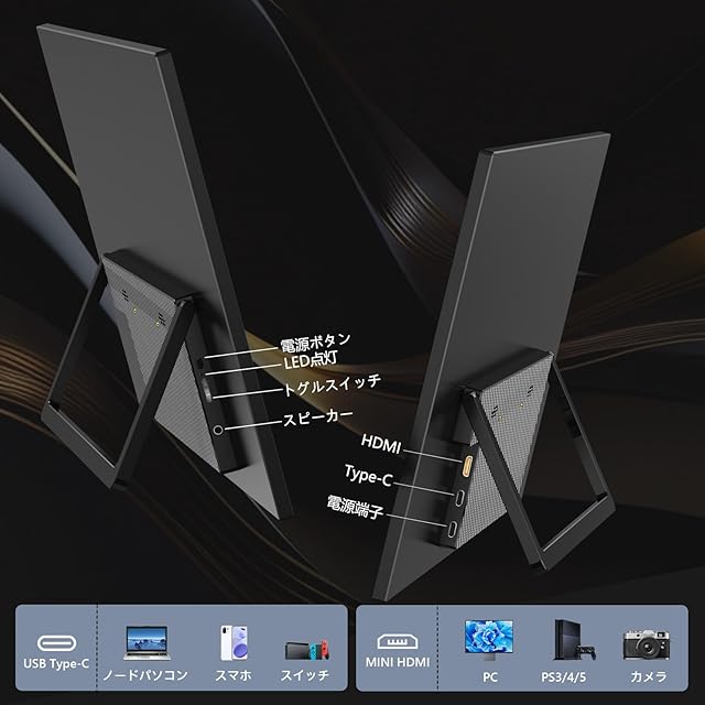【Type-C一本で接続】このモバイルモニターは2つのフル機能Type-Cポート、一つミニHDMIポートを備えており、電力供給とディスプレイ信号伝送のために1本のUSB Type-Cケーブルのみが必要です。※ご使用のデバイスは、Thunderbolt 3.0またはUSB3.1Type-Cポートに対応している必要があります。ノートパソコン、PC、スマートフォン、MacBook、PS5/PS4、Xbox、Switchなど、多様なデバイスとの接続をサポートします。※HDMIとUSBA接続も可能です。