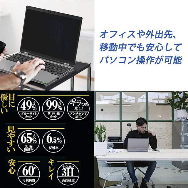【覗き見防止】60°外から画面が黒く見え、移動中も安心<br> 【目に優しい】ブルーライト49%・紫外線99.9%カット<br> 【両面使える】光沢/反射防止で好みに合わせて選べる<br> 【簡単取付】突起を溝にはめるだけで誰でも装着可能<br> 【専用設計】CF-SRシリーズ対応<br>