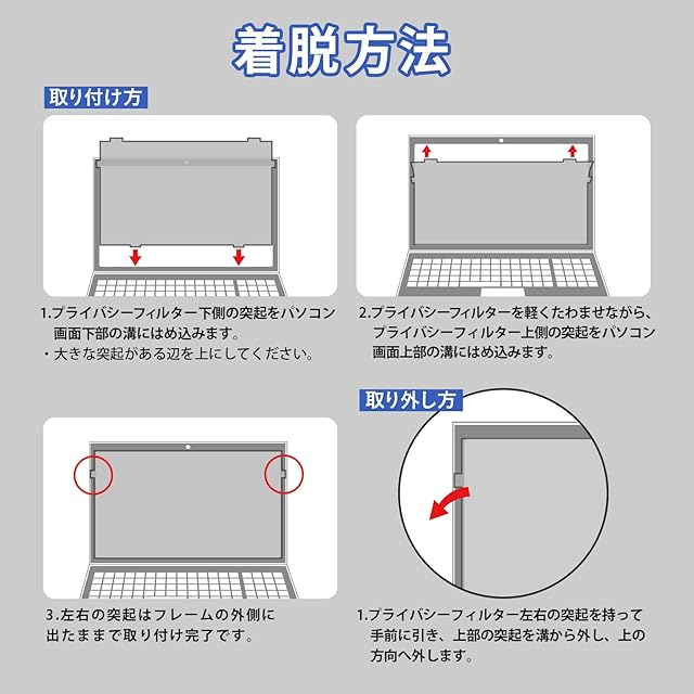 【取付け簡単】フィルターの左右と下部にある突起をレッツノート CF-SRシリーズ パソコン画面の溝にはめ込むだけで、簡単に取り付けられます。また、フィルター上部のつまみを手前に引けば、取り外すことができます。※2023年10月にCF-SRシリーズのサイズにぴったり合うよう調整を行いました。