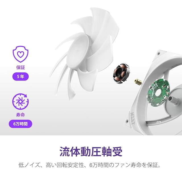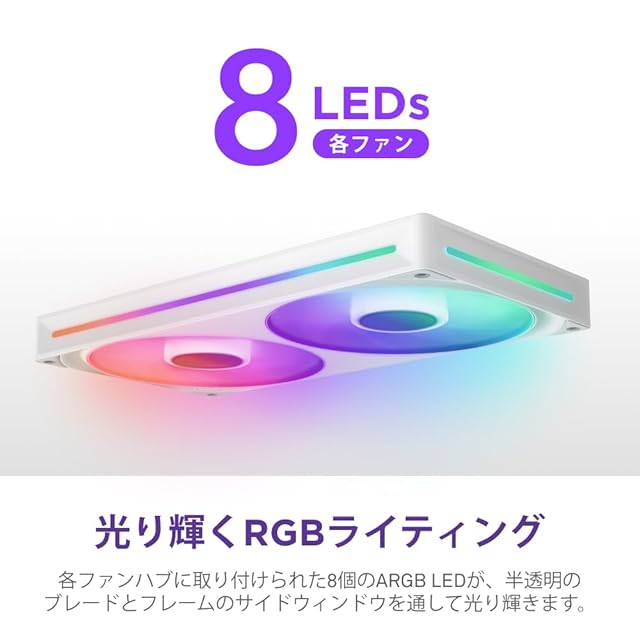 ファンごとに8個のRGB LEDが搭載されており、半透明のブレードを照らします。NZXT CAMを使用して、ライティングを個別にカスタマイズし、他のNZXT製品と同期させることができます。