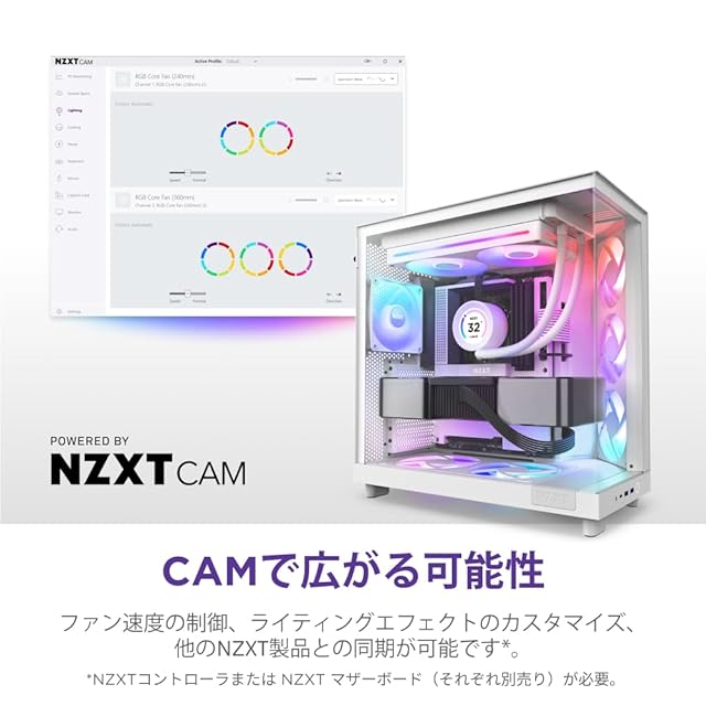 シングルフレームデザインにより、取り付けが簡単で、デジタル制御もシンプルです。NZXT RGB & Fan Controller(別売)に接続することで、CAMソフトウェアを使用してライティングとファンの動作を一元管理できます。