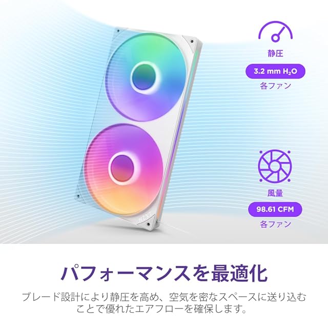 冷却性能と静圧のバランスが取れた設計で、500~2000 RPMの回転速度で、98.61 CFMの高いエアフローを提供します。これにより、PCの内部を効率的に冷却し、システムのパフォーマンスを最適化します。