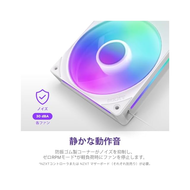 ファンごとに8個のRGB LEDが搭載されており、半透明のブレードを照らします。NZXT CAMを使用して、ライティングを個別にカスタマイズし、他のNZXT製品と同期させることができます。
