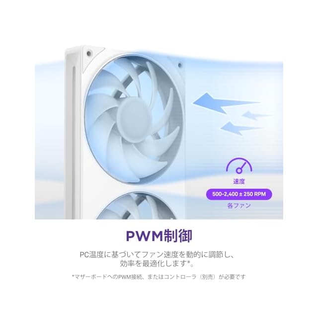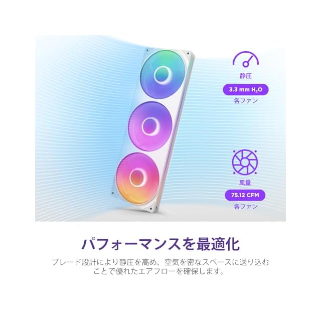 冷却性能と静圧のバランスが取れた設計で、500~2400 RPMの回転速度で、75.12 CFMの高いエアフローを提供します。これにより、PCの内部を効率的に冷却し、システムのパフォーマンスを最適化します。