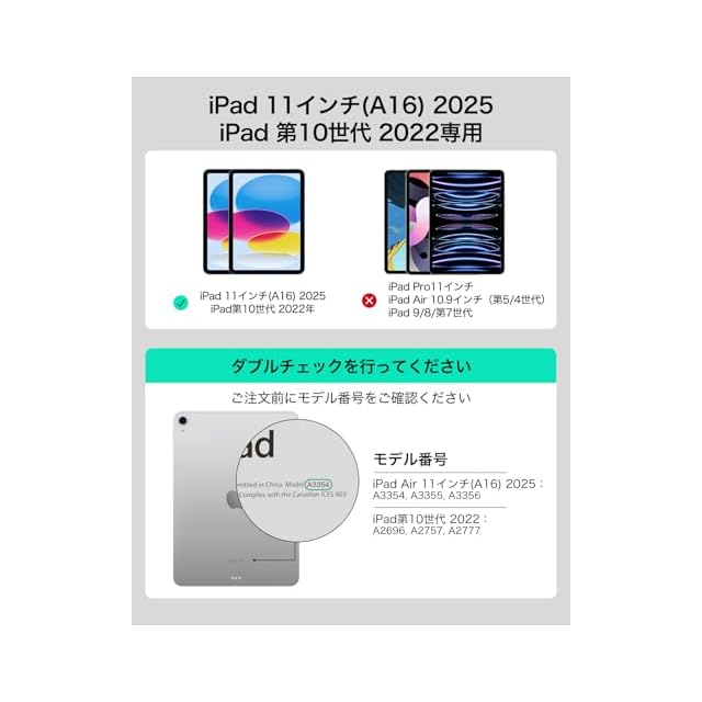 互換性:iPad第11世代(A16,2025)/第10世代、モデルA3354、A3355、A3356、A2696、A2757、A2777、A3162のみ対応