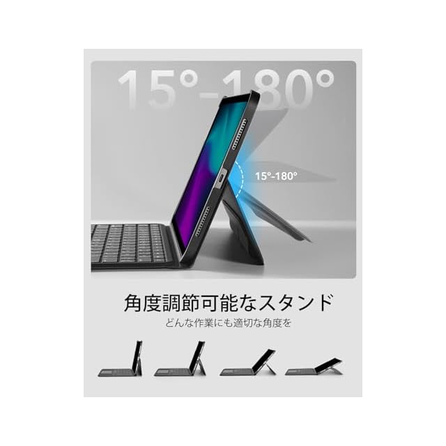 【角度調節可能なスタンド】:15°から180°まで、用途に合わせて角度調節が可能です。