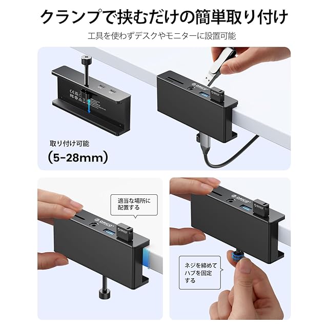 【クランプ固定式、省スペース】クランプとUSB C ハブはネジで組み合わせる設計で、工具を使わずデスクやモニターに設置可能、省スペースのデザインです。固定する部分が可動式なところですから、カーブのモニタもしっかり固定できます。(約5~28mmの厚さを対応できる)