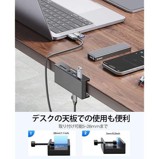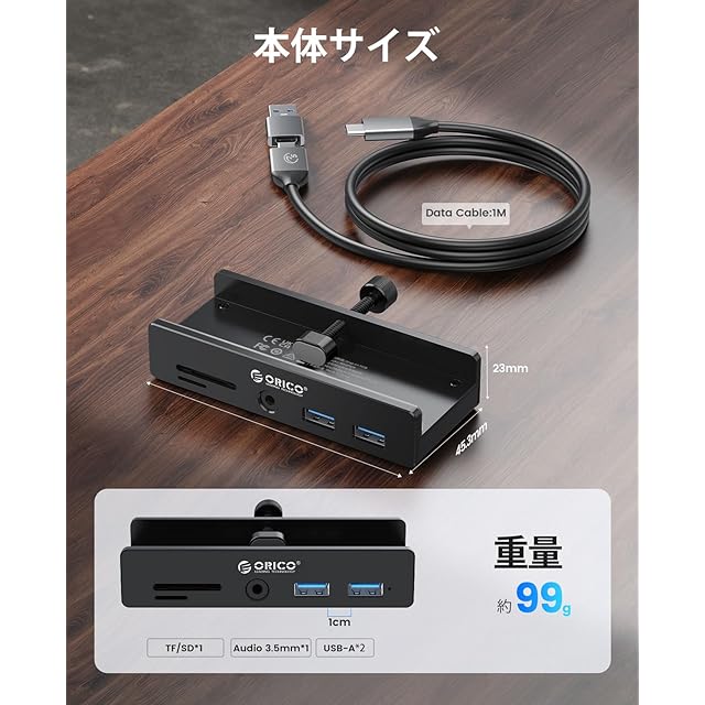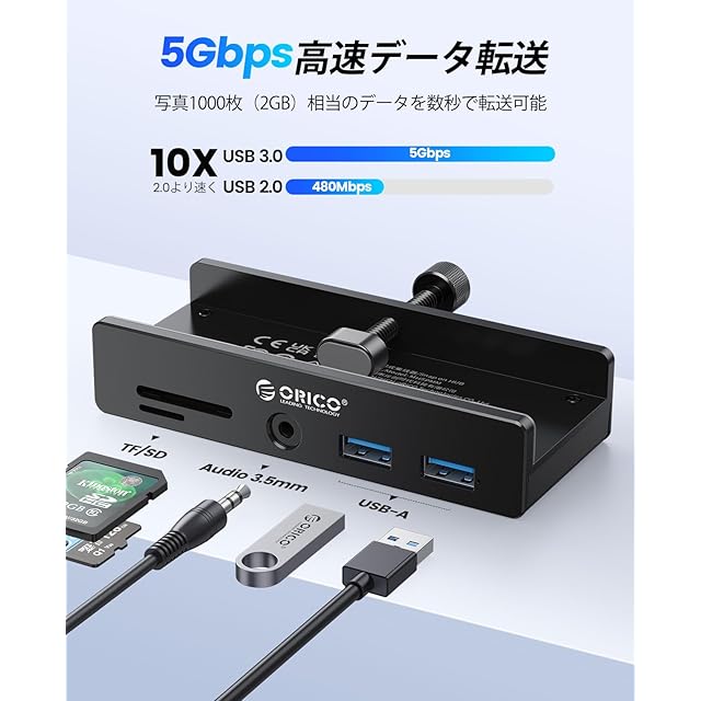 本製品はクランプで机やモニターに取り付けられて固定で、省スペースで設置できるUSB C ハブ クリップです。 USBポートを抜き差しも安定して片手作業できるドッキングステーションです。。 USB C ハブ クランプは5~28mmの厚さに対応し、内部にバネを内蔵し、天板などと接触する面には傷を付けにくいシリコンの滑り止めを採用しています。 USB 3.0 Aポートが2個、TF/SDカードスロットと3.5mmオーディオポート搭載され、合計5台のUSB機器を接続することができるUSBハブです。USB3.2 Gen1(理論値5Gbps)の転送速度に対応しています。 USB HUBには通電確認用のLED付きで状況が一目でわかります。 約1m長でUSB Type-cケーブル(2in1C To A/C)付属して変換アダプタ不要でusb ハブ セルフパワーでもデスク下のPCや昇降デスクでも設置できます。 またusb hub の固定する部分が可動式なところですから、カーブのモニタもしっかり固定できます