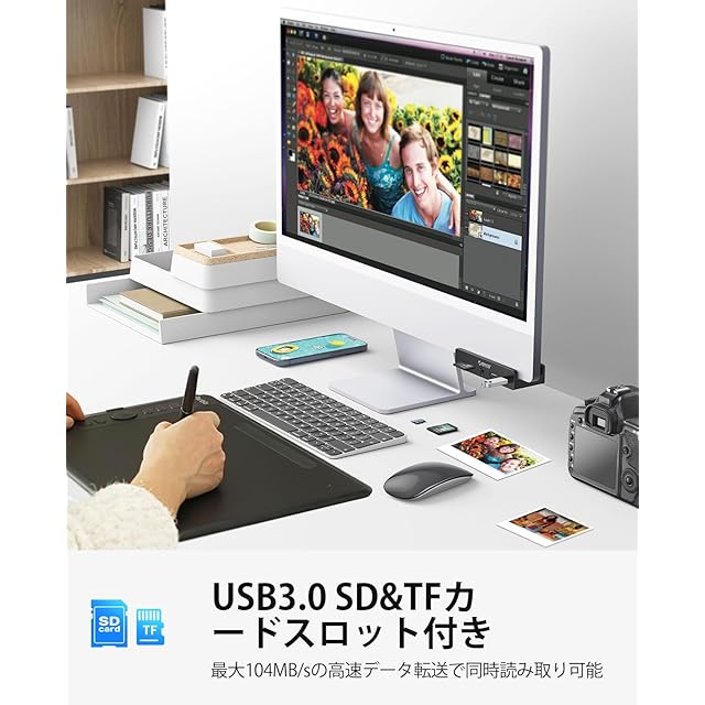 【5つのポートを1つに】パソコンのUSB-Cポートから、TF/SDカードスロット、2つのUSB-Aポート、3.5mmオーディオポートに接続が可能です。5つUSBポートはUSB3.2 Gen1(USB 3.0)にも対応できます。5Gbpsデータ転送速度が速いので、写真1000枚(2GB)数秒で転送できます。USB2.0の10倍です。(更新版の USBポートは1cm間隔があり、互いに干渉しません)