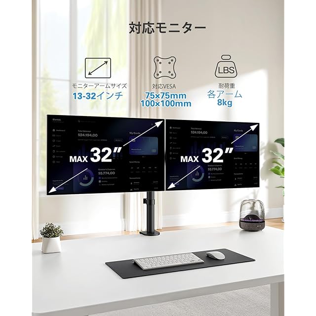 商品名:HUANUO (ファーノー) モニターアーム デュアル 13~32インチ対応 耐荷重8kg ディスプレイアーム 2画面 PCアーム ロング VESA 75x75mm 100x100mm対応 クランプ式 グロメット式 角度調節 HNCM25