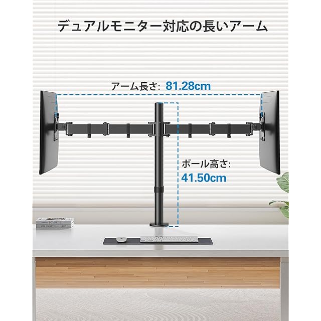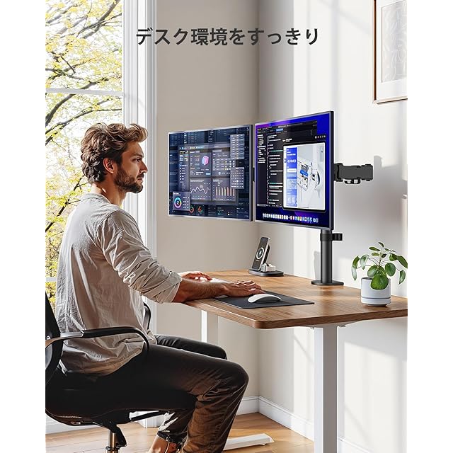 【省スペース】デュアルモニターアームは液晶モニターを狭いスペースに設置できます。本製品は、取り付ける机に合わせてグロメットとクランプの2種類の取り付け方法があります。モニターの台座を必要としないので、モニタ下のスペースに書類やキーボードなどを収納でき、デスクの上を広く使うことができます。