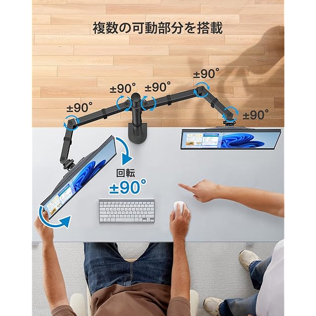 【角度調節】革新的な多軸設計で画面を上45°、下45°、左右90°、回転360°に調節可能で、可動範囲が広くて便利です。デュアルモニターアームでどんな姿勢でも液晶画面が見れて、目の疲れを軽減でき、作業効率が上がります。