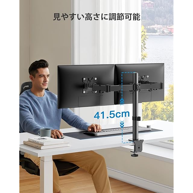 【猫背対策】41.5cm高さのポールでより広い範囲の画面の高さを調節できます。自分にあった位置へディスプレイを設置することで猫背などの習慣が改善できます。個々人の体格に合わせて高さの微調整を行えるため、大人と子どもなど複数の人でシェアする場合にも適しています。