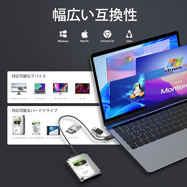 【SATA USB3.0アダプター互換性】最大18TBまでの2.5/3.5インチSATA I / II / III HDD・SSD・光学ドライブに対応。BLU-RAY DVD/CD-ROM/DVD-ROM/CD-RW/DVD-RW/DVD+RWなどのコンボ・デバイスにも対応。※ご注意:3.5インチのHDD / SDDに接続する場合は、安定した動作をするために、付属の電源アダプターを通して製品に電力を供給することをしてください。