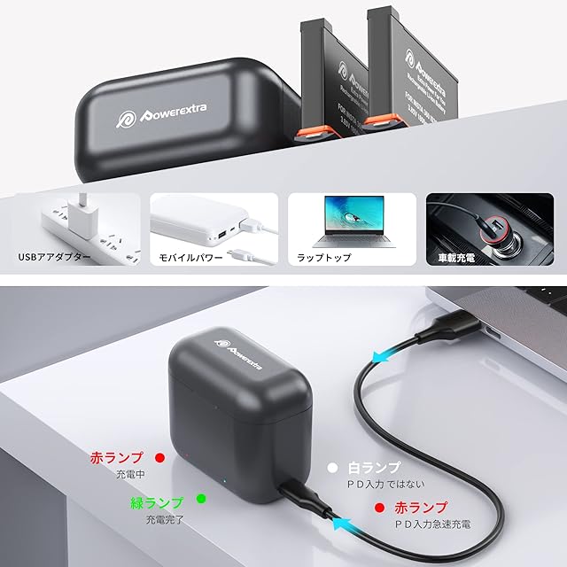 【便利な充電方式】 付属のデュアル充電器で、バッテリー2個を同時に充電でき、時間を節約し、常に撮影準備ができます。USBで給電する設計により、モバイルバッテリーからも、コンセントから、ソラーチャージャーからもお手軽くバッテリーパックを充電可能で、旅行やハイキングに最適。