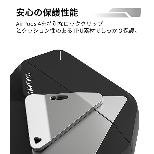 商品名:AULUMU A29 AirPods 4 ケース AirPods 第4世代ケース (2024) ジオメトリックデザイン 亜鉛合金ロック 脱着式ナイロンストラップ付き 耐衝撃TPU 強化コーナー保護 ブラック