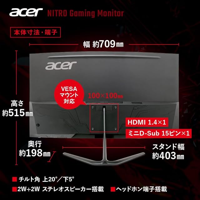 Acer Nitro 湾曲 ゲーミングモニター 31.5インチ ワイド フルHD 非光沢 広視野角VA 100Hz 1ms(VRB) AMD FreeSync ブラックブースト ブルーライト低減 HDMI 1.4 ミニDSub 15ピン スピーカー・ヘッドフォン端子 VESAマウント対応 ゼロフレームデザイン ED320QRHbmix | TREND DESIGN 家電専門店