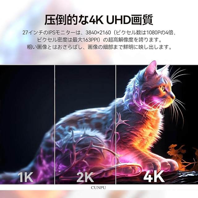 【27 インチの究極のUHD4K世界】:CUNPU 27インチ 4K モニターは、超高解像度のUHD4Kの組み合わせにより、驚異的な 4K 解像度により、1080Pの4倍もの精密な画質を実現します。UHD4K(3840×2160)解像度と163PPI の高密度画素配置により、1 つ 1 つのピクセルまで鮮明に映し出し、画像編集やマルチタスク時も、多様なオフィスシーンで快適な作業環境を提供します。