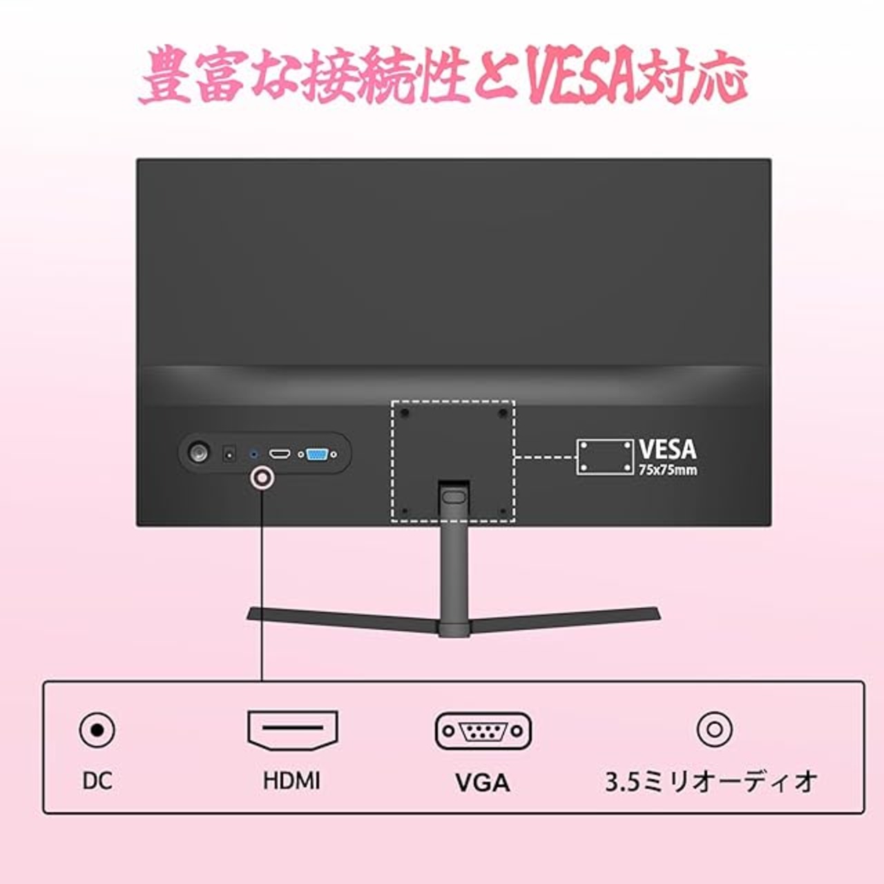 【豊富な接続性】本ディスプレイは豊富な接続端子を備えており、HDMI×1、VGA×1、3.5mmオーディオジャック×1を装備。PS5やXbox、Switchなどのゲーム機器はもちろん、PCやオーディオ機器にも簡単に接続可能です。さらに、内蔵スピーカー(2×3W)を搭載しているため、外部スピーカーがなくても迫力あるサウンドをお楽しみいただけます。また、VESA規格(75mm×75mm)に対応しており、壁掛け設置やモニターアームへの取り付けも可能です。