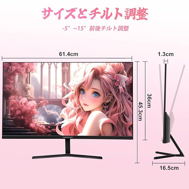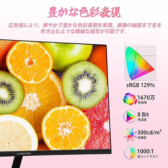 XUNDEFINED 27型の超薄型ディスプレイ このゲーミングモニターは、PCモニターとしてもパソコンモニターとしても最適な液晶モニターです。スリムベゼルとフレームレスデザインの大画面モニターで、サブディスプレイとしても活用可能。FHD(フルHD 1920×1080/1080p)の高解像度とIPSパネルにより、sRGB129%の広色域で鮮やかな色彩を再現します。 滑らかなプレイを実現する100Hzリフレッシュレートと1msの高速応答速度を搭載し、FreeSync/Adaptive Sync技術で画面のティアリングを軽減。HDR対応で深みのある映像が楽しめ、Switch・PS4・PS5などのゲーム機にも接続可能。スピーカー内蔵(スピーカー付き)でスッキリとしたセットアップが実現します。 接続端子はHDMI 2.0×1、VGA×1、ヘッドホン端子(Audio Out)×1を装備。VESA対応(75×75mm)でマルチモニター環境にも最適です。フリッカーフリーとブルーライト軽減機能で長時間の使用でも目に優しく、安い価格ながら高性能。薄型デザインで省スペース。 コントラスト比1000:1、輝度300cd/㎡、16.7万色(8bit)の豊かな色表現と、水平/垂直178°の広視野角を誇ります。-5°~15°のチルト調整で快適な視聴位置をサポート。コンピューターモニター(computer monitor/display)として、仕事にも遊びにも最適なLCDディスプレイです。