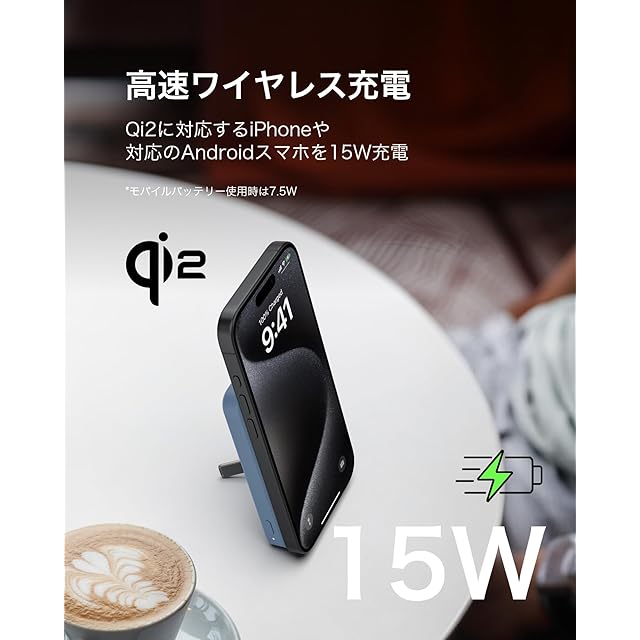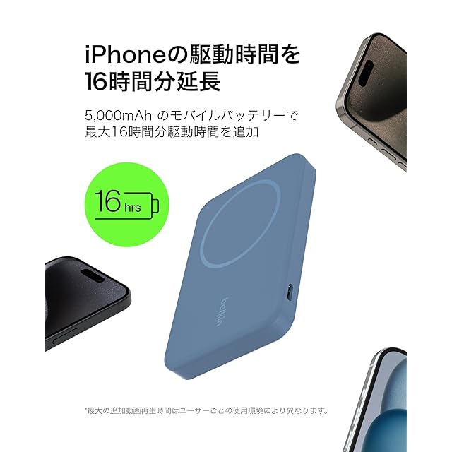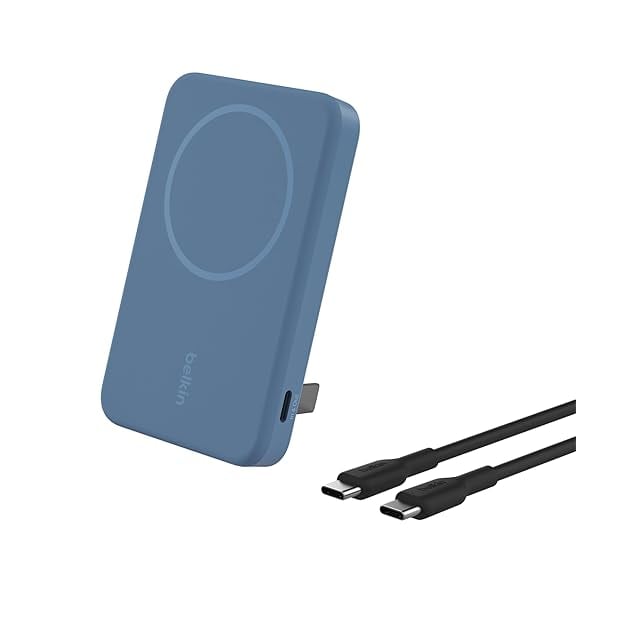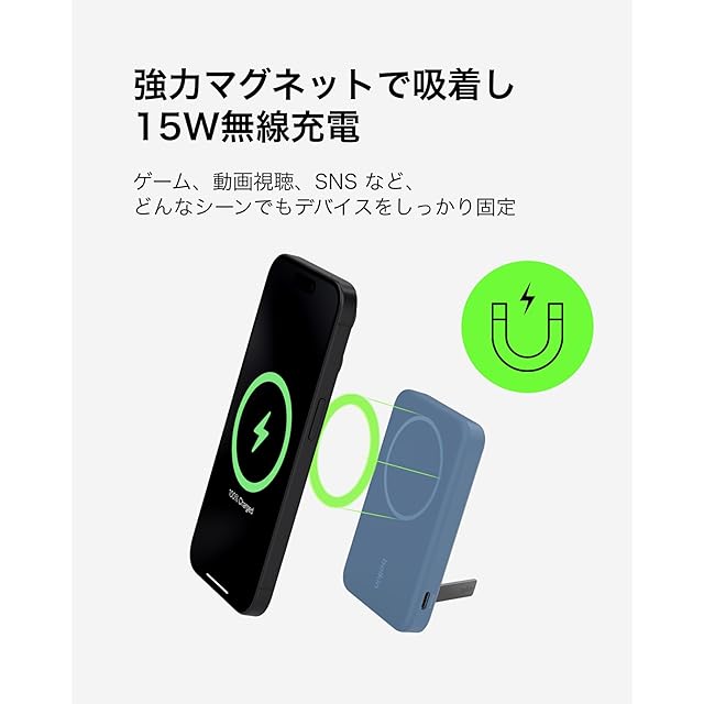 商品名:Belkin Qi2対応 ワイヤレスモバイルバッテリー 3C対応 5000mAh iPhone 16/15/14/13/12/Qi2対応Android ワイヤレス出力(7.5W) Cポート入出力 パススルー充電対応 PSE技術基準適合 機内持ち込み可能 充電用ケーブル同梱(USB-C to C 1m) メーカー2年 キックスタンド付き ブルー BPD006fqBL