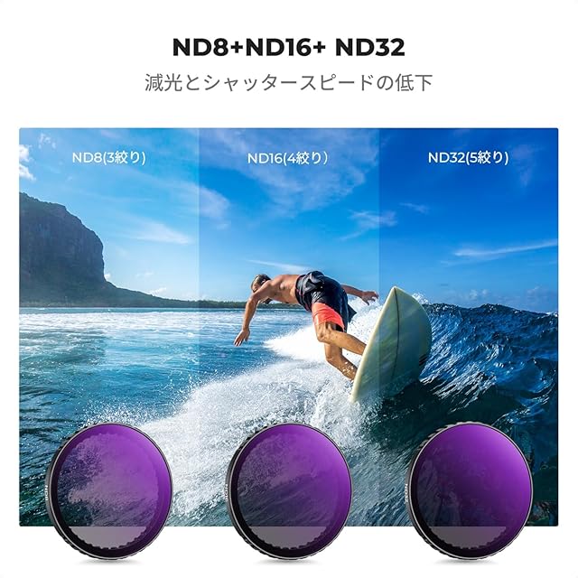 【減光効果&シャッタースピードの調整】NDフィルターセット(ND8/16/32)を使えば、明るい環境でも適切な露出を得ることができます。また色のバランスを保ちながら光を減少させるため、全体的な色彩の質を向上させます。風景撮影、ポートレート、ビデオ撮影など、さまざまなシーンで使用でき、プロフェッショナルからアマチュアまで幅広いユーザーに支持されています。