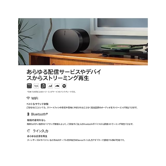 【新体験のユーザー・インターフェイス】Sonos Era 300は、Sonos Voice Control、Sonosアプリ、Apple AirPlay 2、Bluetoothで即座かつ思いのままに 音楽を操作できるほか、タッチ操作によるスライドコントロールを新たに搭載し、さらに直感的な操作性を実現しています。 【接続オプションを拡充】WiFiやBluetoothでお気に入りのコンテンツをストリーミング再生。AUXケーブルとSonosライン入力アダプターを使用すれ ば、ターンテーブルなどの外部プレーヤーも直接接続できます。