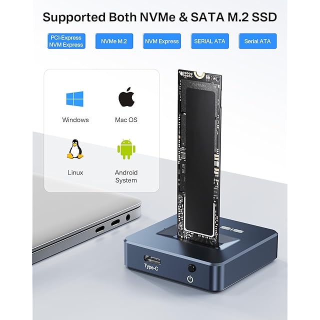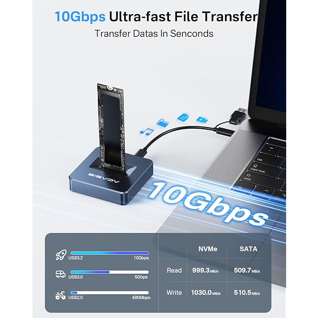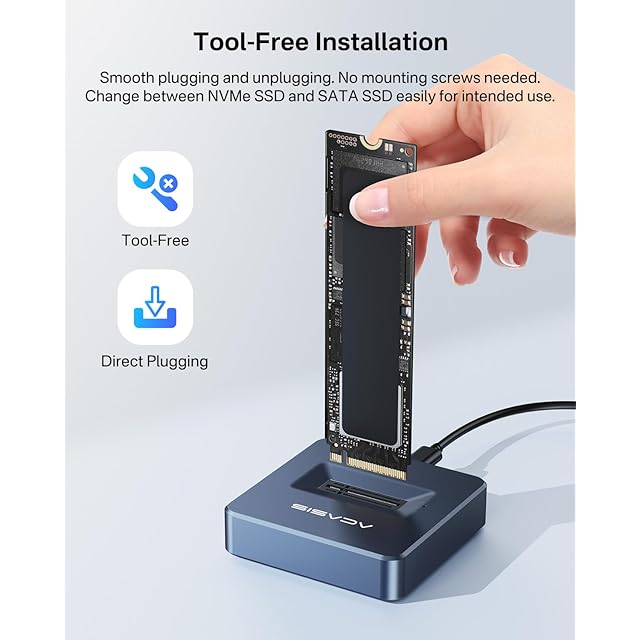 【M.2 NVMe/NGFF SATA 両対応 SSDドッキングステーション】 ACSIS製 M.2 SSDケースは、2230/2242/2260/2280mmサイズの M.2 SSD(NVMe PCIe および NGFF SATA)を両方サポート。NVMeはMキー/B+Mキー、SATAはB+Mキー対応。高性能RTL9210Bチップ搭載で最大10Gbps転送を実現。2台のドライブ導入不要で、時間・手間・コストを節約。最大8TBの M.2 SSD バックアップに最適。ご利用前のSSDインターフェース/プロトコル確認をお願いします。