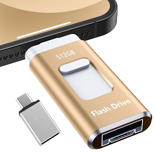 【専用アプリ不要 アルバム整理簡単】Phone用USBメモリ 4in1 USBメモリ512GB phone用外付けメモリ 高速USB3.0 タイプc usbメモリー IOS/Android/PC/Macに対応 phone兼用 バックアップ アプリ不要 スマホ usbメモリ phone 写真データ保存 スマホ容量不足解消 写真画像撮り放題(ゴールド)