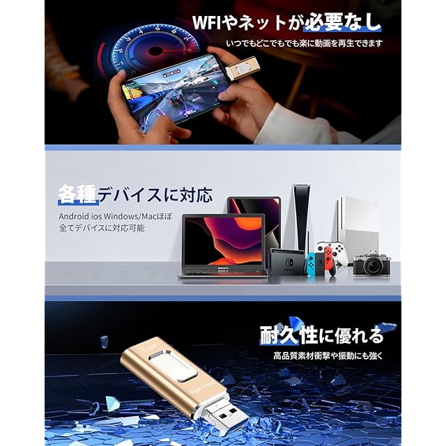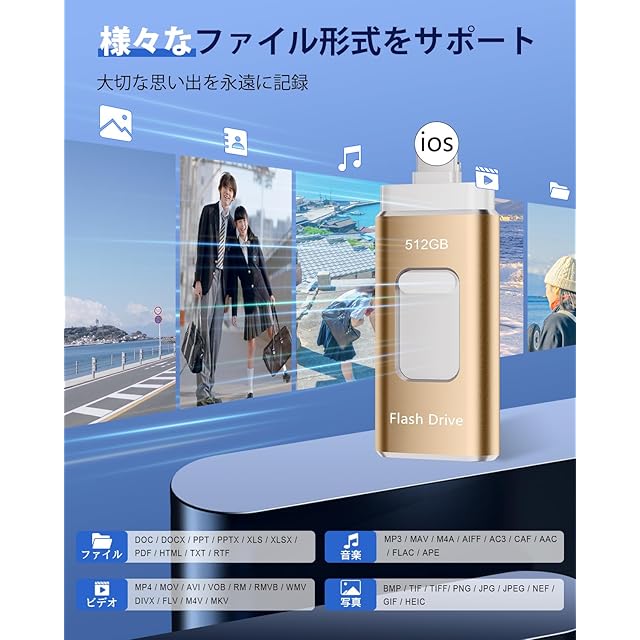 商品名:【専用アプリ不要 アルバム整理簡単】Phone用USBメモリ 4in1 USBメモリ512GB phone用外付けメモリ 高速USB3.0 タイプc usbメモリー IOS/Android/PC/Macに対応 phone兼用 バックアップ アプリ不要 スマホ usbメモリ phone 写真データ保存 スマホ容量不足解消 写真画像撮り放題(ゴールド)