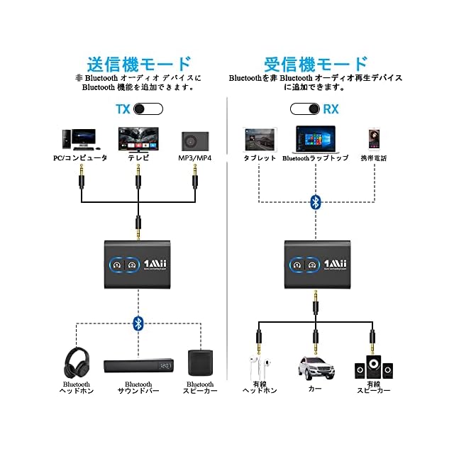 【Bluetoothトランスミッター&レシーバー】1Mii ML300 ブルートゥース 送受信機はBluetooth トランスミッターとBluetooth レシーバーとして使用できます。TXモード-Bluetooth非対応のテレビ、フライト、フィットネスデバイスやPCから、Bluetooth対応のヘッドホン/スピーカーに簡単にオーディオを転送できます。3.5mm AUX端子を持つ機器で動作すればRXモード-スマホ、タブレット、ラップトップからホームステレオ、有線スピーカー、車にワイヤレスコンテンツを転送します。