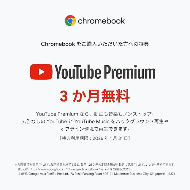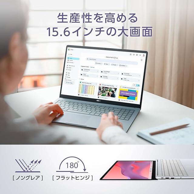 【OS】ChromeOS【カラー】ピュアグレー【ディスプレイ】15.6型ワイドTFTカラー液晶、ノングレア、1.920×1,080ドット (60Hz)【本体サイズ】幅359.5mm×奥行き23.22mm×高さ20.1mm 約1.59kg