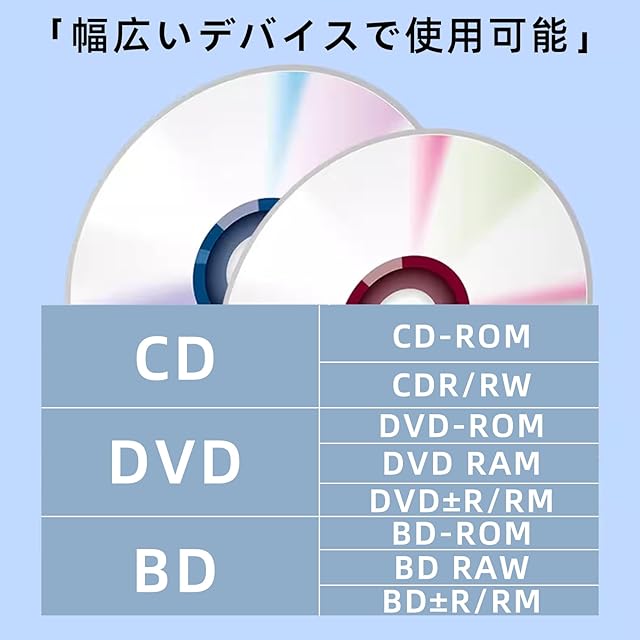 【多彩なメディア形式対応】 CD-R/RW、DVD+R/RW、DVD-R/RWなど主要なフォーマットに対応し、M-DISC(専用ソフトウェアが必要)もサポートしています。ただし、古いディスクや埃が付着している場合、正しく認識されないことがあります。