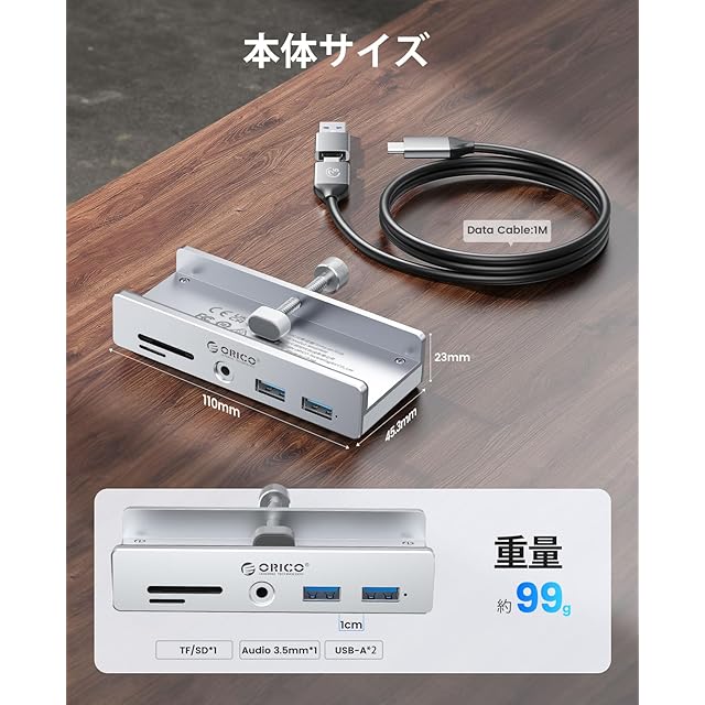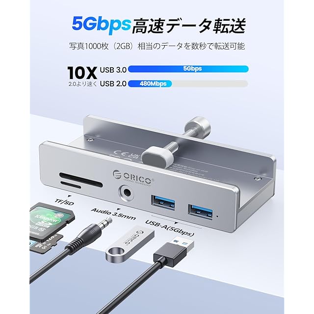 ORICO USB-Cハブ クランプ式 5ポート(TF/SDカードリーダー、USB-A×2、3.5mmオーディオ) 5Gbps高速転送 USB-C 給電ポート付き(5V) バスパワー/セルフパワー対応 1mケーブル付 アルミ pc周辺機器 Windows/Linux/Mac対応 MH5PMM シルバー | TREND DESIGN 家電専門店