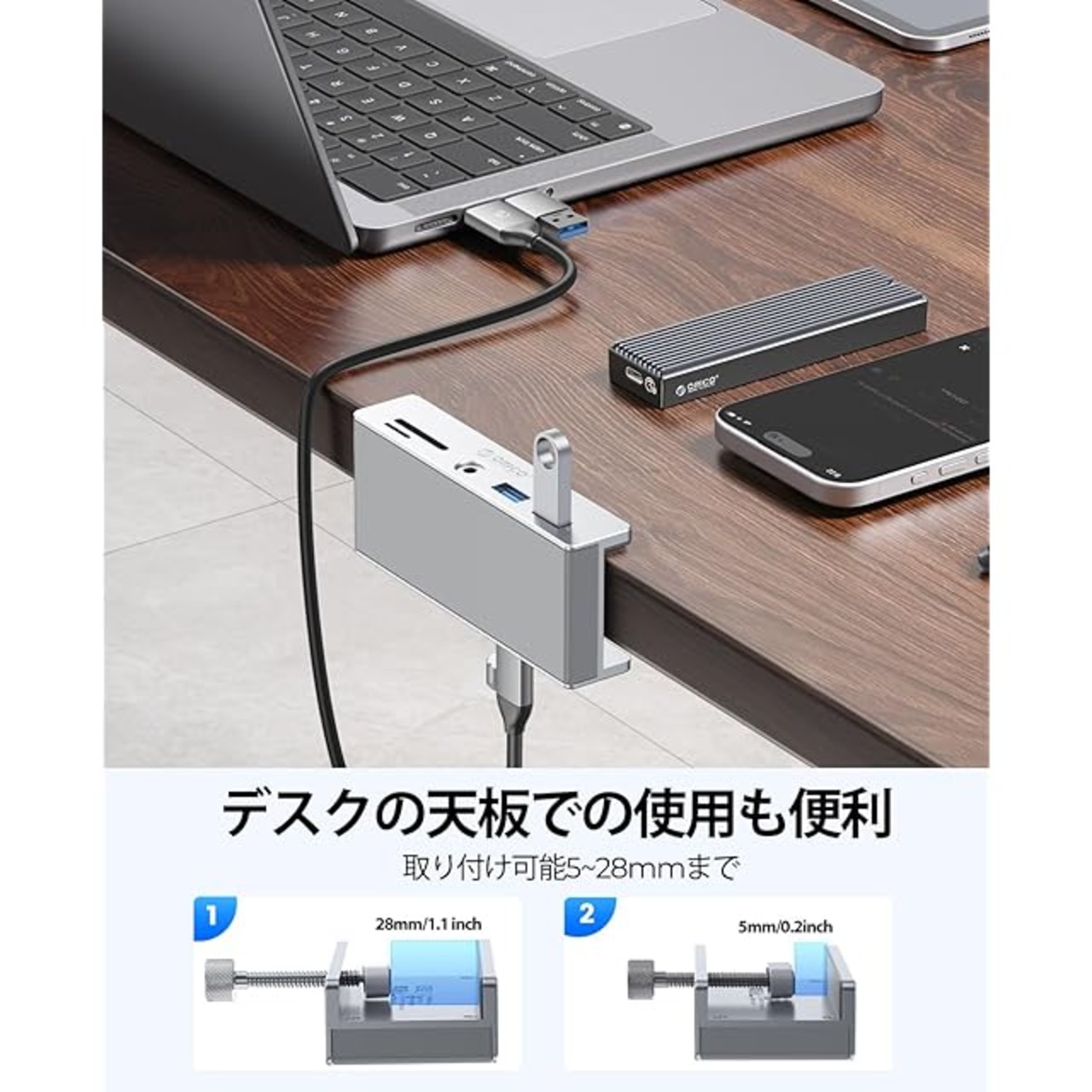 商品名:ORICO USB-Cハブ クランプ式 5ポート(TF/SDカードリーダー、USB-A×2、3.5mmオーディオ) 5Gbps高速転送 USB-C 給電ポート付き(5V) バスパワー/セルフパワー対応 1mケーブル付 アルミ pc周辺機器 Windows/Linux/Mac対応 MH5PMM シルバー