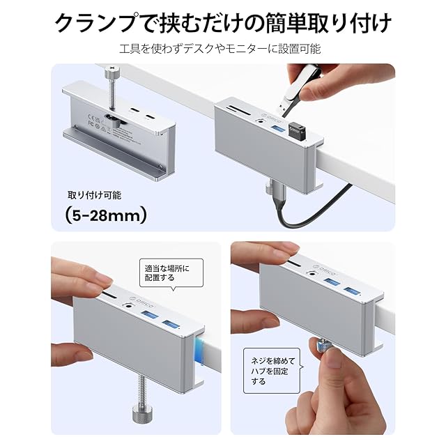 【省スペース、クランプ固定式USBハブ】クランプとUSB ハブ 3.0はネジで組み合わせる設計で、工具を使わずデスクやモニターに設置可能、省スペースのデザインです。固定する部分が可動式なところですから、カーブのモニタもしっかり固定できます。(約5~28mmの厚さを対応できる)