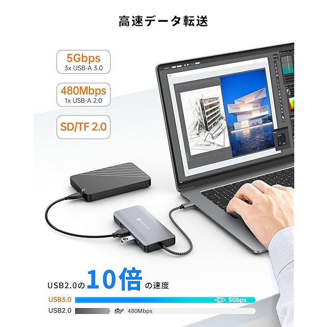 信頼性の高い高速データ転送:2つのUSB 3.0ポートは、最大5Gbpsの転送速度をサポートし、スマートフォン、タブレット、ハードドライブなどのデバイスと簡単にデータを転送できます。また、USB-Cポートを通じてデータの転送がスムーズです。2つのUSB 2.0ポートは、最大480Mbpsのデータ転送をサポートします。ご注意:USB 3.0はワイヤレス接続に干渉することがあるため、ワイヤレスマウスやキーボードはUSB 2.0ポートを使用することをおすすめします。さらに、SD/TFカードリーダー(最大104 Mbps)は、ファイルに迅速にアクセスし、写真やビデオを素早く転送できます。写真家、デザイナー、ビデオ編集者などに最適です。