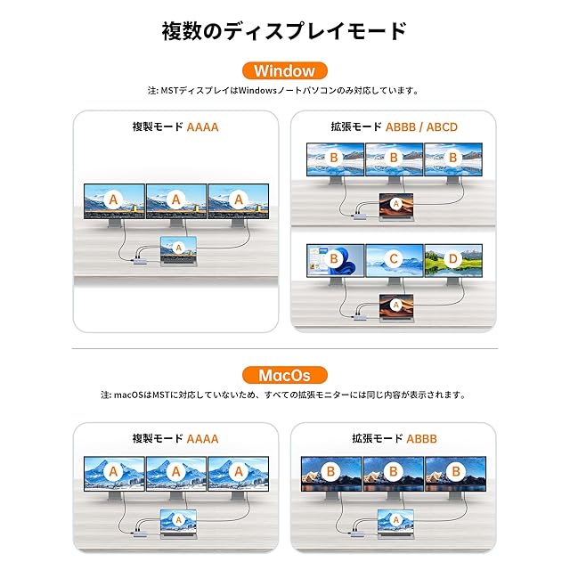 驚異的な4Kトリプルディスプレイ:このUSB C ドックは、デュアルHDMI+DPポートを搭載し、ラップトップの画面を最大3台の外部モニターにミラーリングまたは拡張できます。タイプ-C ハブは、Windowsシステム、DP1.4 DSCで、4K@60Hzの1HDMI、4K@30Hzの1HDMI、フルHD 1080p@30Hの1DPを介してUHD 4Kビデオを提供します(ラップトップの帯域幅によって制限されます)。ご注意:Mac OSシステムは制約があり、SSTモードのみをサポートします。つまり、4つの画面の表示はラップトップ(A画面)+モニター1(B画面)+モニター2(B画面)+モニター3(B画面)になります。*ご注意:MSTはWindowsシステムのみ対応しています。