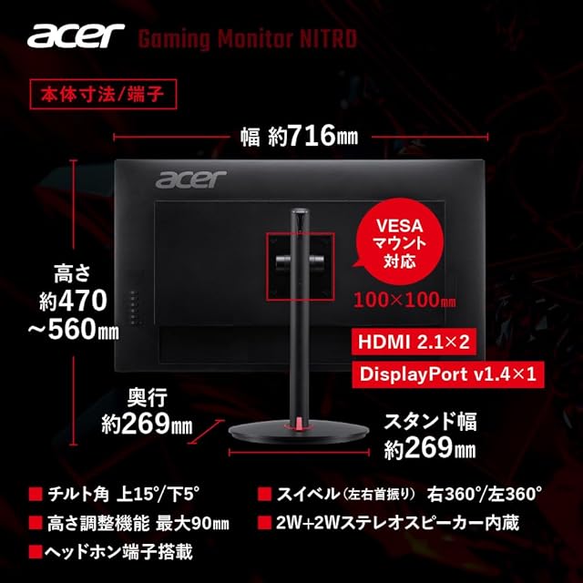 商品名:Nitro ゲーミングモニター 31.5インチ 4K 高速IPS 非光沢 160Hz 0.5ms DCI-P3 95% Delta E<1 AMD FreeSync Premium VESA DisplayHDR 400 HDMI 2.1 DisplayPort1.4 スピーカー内蔵 ヘッドホン端子 VESAマウント対応 高さ調節 XV322QKV3bmiiphx