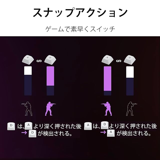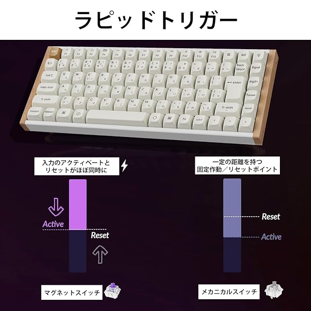 【ラピッドトリガー:瞬時の反応でゲームに勝利】 キーの移動量に応じてリアルタイムで反応するラピッドトリガー機能を搭載。キーのアクティベーションとリセットをリアルタイムに感知し、正確かつ瞬時の応答を実現。激しいゲームプレイでも競争優位を獲得します。