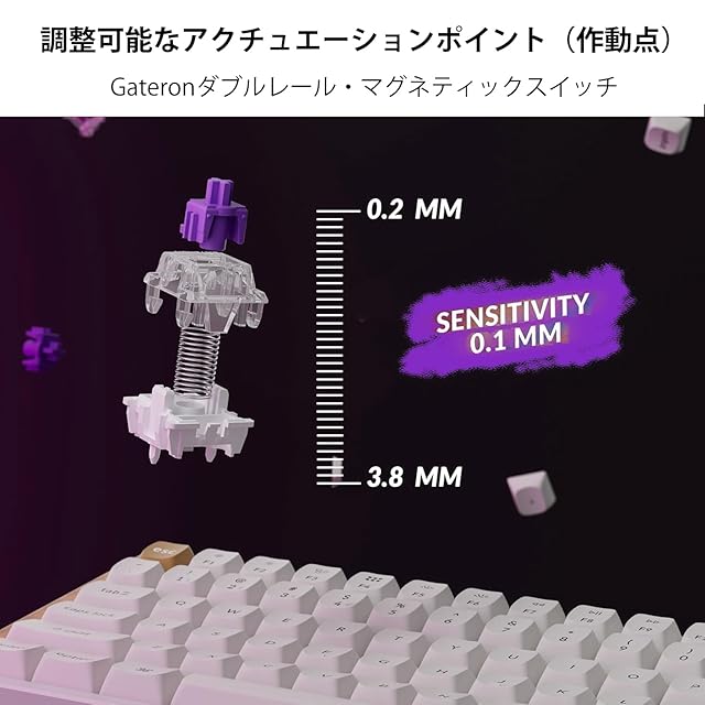 【Gateronダブルレール・マグネティックスイッチ】 Keychron K2 HEは、あらかじめ潤滑処理されたGateron製ダブルレール・マグネティックスイッチを搭載し、業界トップクラスの超高速レスポンスと精確な操作性を実現。比類なき滑らかさと安定感で、究極のタイピング体験をお楽しみください。あらかじめ潤滑されたGateron ダブルレールマグネティックスイッチを搭載。 ホットスワップ対応で、0.1mm単位の感度調整が可能。 0.2mm〜3.8mmの範囲でアクチュエーションのカスタマイズが可能。(Gateronダブルレールマグネティックスイッチ専用)