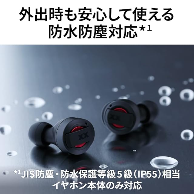 【アクティブなシーンでも安心して使える】衝撃からイヤホンを守るラバープロテクターに加え、IP55相当の防水※1・防塵※1を実現した「TRIPLE PROOF」タフボディを採用。汗や水、砂埃に強くアウトドアやストリートなどのアクティブなシーンでも安心して使えます。※1:JIS防塵・防水保護等級5級(IP55)相当。イヤホン本体のみ対応。