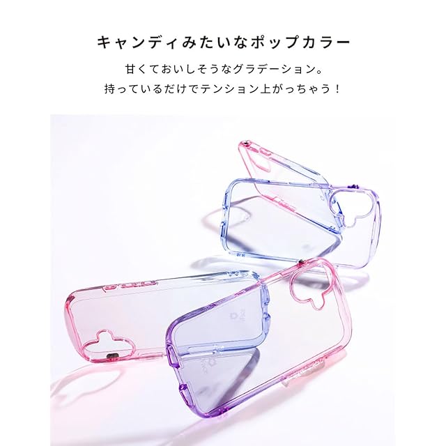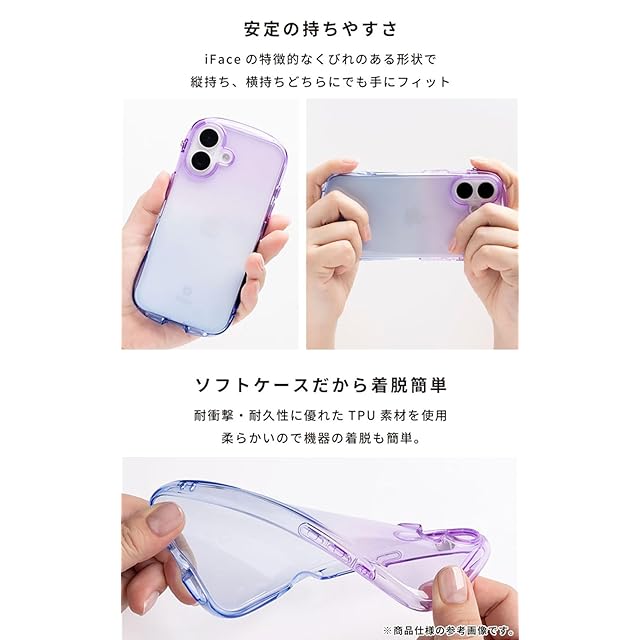 グラデーションが印象的なiFace Look in Clear Lolly(ロリー)。<br>iPhoneの色を透かして自分なりのグラデーションカラーを楽しめます。<br><br>・クリアな背面に、シールや写真を入れてカスタマイズが可能<br>・手にしっかりフィットする「くびれ」形状で持ちやすさ抜群<br>・弾力のあるTPUで、端末をしっかり保護<br>・画面とカメラを守る、フチ高設計<br>・ドット加工で密着痕を防ぎ、見た目を美しく保つ<br>・サイドホールもしっかり対応。カメラコントロールもスムーズに※カメラコントロール機能がない機種は仕様が異なります。<br>・選べる2カ所のストラップホール<br>・シグネチャーボール搭載でストラップの付け方が広がる<br><br><br>●本製品ご使用における人体・デジタルデバイス本体を含む持ち物・データなどの損傷、損失、紛失に対し、弊社は一切の責任を負いかねます。<br>●使用前に記載事項を必ずご確認ください。<br><破損や思わぬ怪我の原因となりますので以下の事項は絶対におやめください><br>・本製品に過剰な力を加えること<br>・本製品に破損、変形等が生じた場合の使用<br>・火気、高温、多湿な場所での保管、長時間の放置<br>・本来の用途以外での使用<br>・お客様による本製品の加工、改造<br>●デジタルデバイス本体やケースに発熱などの異常がある場合は本製品を外してください。<br>●ケースとデジタルデバイスの間に金属フィルムや金属片を挟むとワイヤレス充電時に異常発熱や機器故障の原因となることがあります。<br>ケースのカスタマイズ時には十分ご注意ください。<br>●本製品およびパッケージは改良のため予告なく仕様を変更する場合があります。<br>●当社の許諾なしに無断で転載、複製することは固く禁じます。<br>●記載されている製品名・会社名などは各社の商標または登録商標です。<br>●画面保護フィルムの形状により本製品と併用できない場合があります。<br>●背面カメラでの撮影時に写り込みが起こる場合があります。<br>●製品に入っているドット加工は、デジタルデバイス本体との密着痕を防ぐためのものです。<br>●ご使用の充電器や環境によってワイヤレス充電がご利用いただけない場合があります。<br>●ご利用状況・環境、溶剤の使用などにより変色や変質が起きることがあります。<br>●本製品装着やOSアップデートにより、デジタルデバイスの一部機能が使えなくなる可能性があります。<br>●小さな部品がありますので誤飲にご注意ください。<br><br><br><br>商品仕様<br>16用:約縦16×横8.1×厚1.3cm、重量約32g<br>主素材:TPU、ポリカーボネート<br>ストラップ装着:可<br>ワイヤレス充電:可<br>:有<br>
