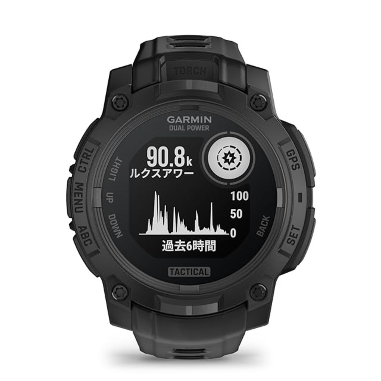 【Dual Power Tactical モデル】ナイトビジョンやステルスモードなどのミリタリー機能を搭載し、ソーラー充電により、無限の超ロングバッテリーを実現できるモデルです。アメリカ国防総省による品質基準「MIL-STD-810」に準拠した、どんな状況にも耐えうるタフネスGPSウォッチ。