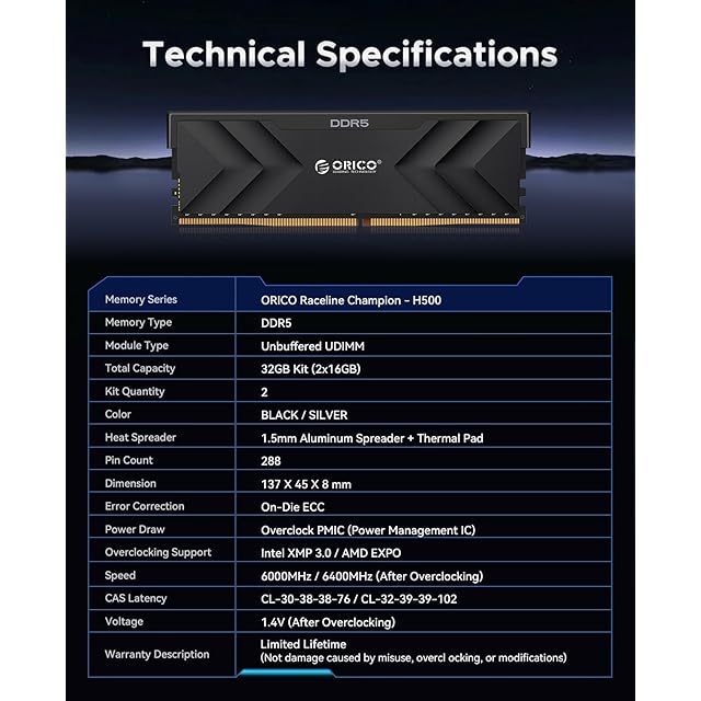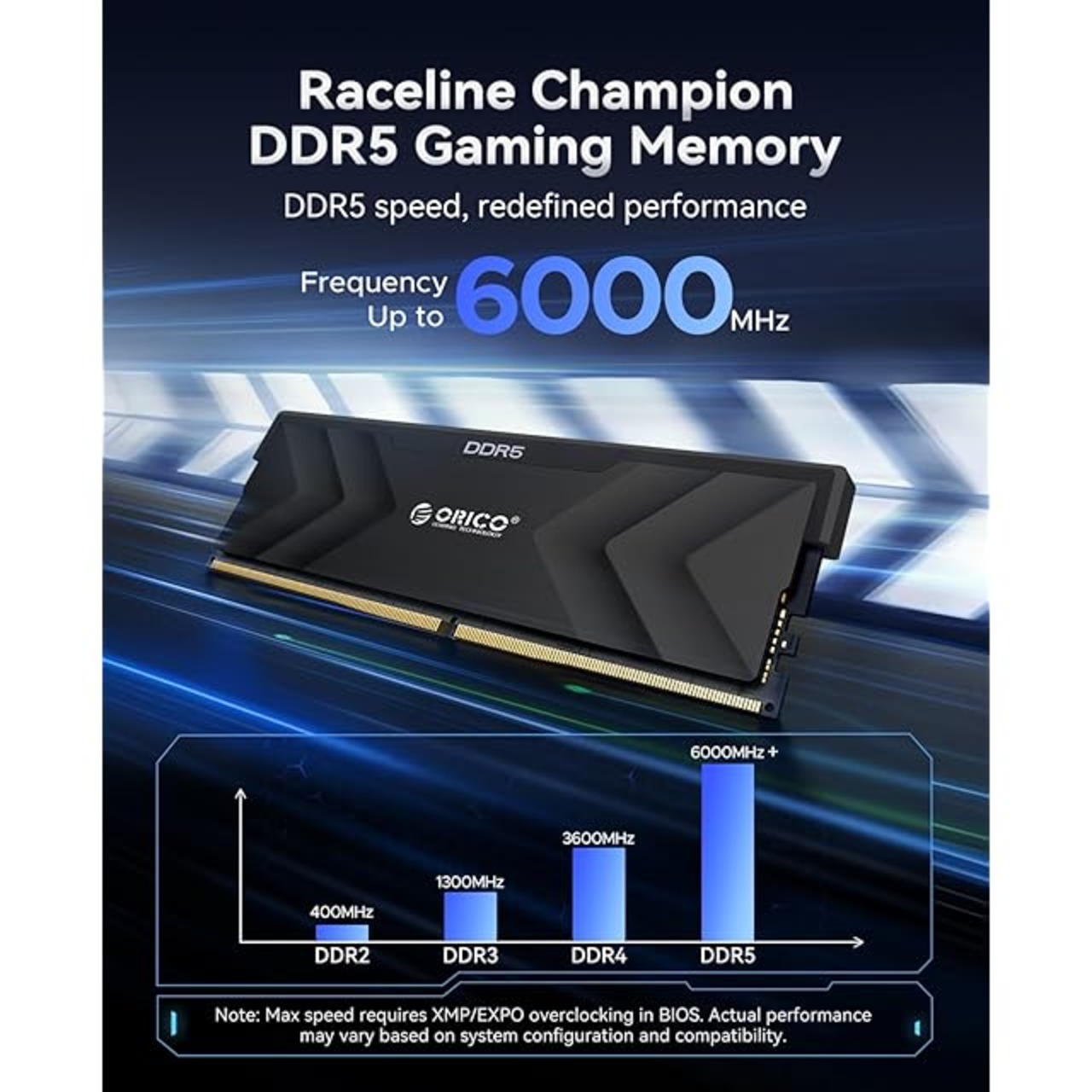ORICO Raceline Champion DDR5 32GB(16GB×2) 6000MHz CL30 ゲーミングメモリ Intel XMP3.0/AMD EXPO両対応 低遅延設計 無バッファDIMM オンダイECC H500ブラック