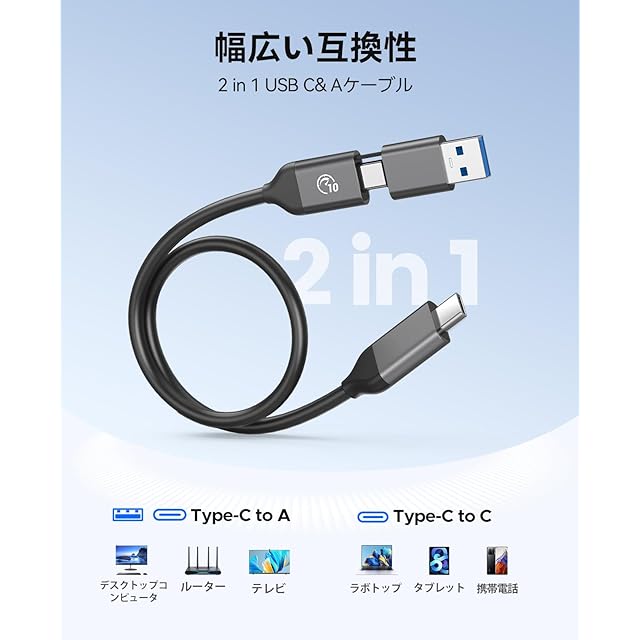 【2 in 1 USB-C & USB-Aケーブル】USB-CおよびUSB-A両対応のケーブル付きで、さまざまなデバイスに簡単に接続できます。ノートPCやスマートフォン、タブレットに対応し、互換性が広がります。